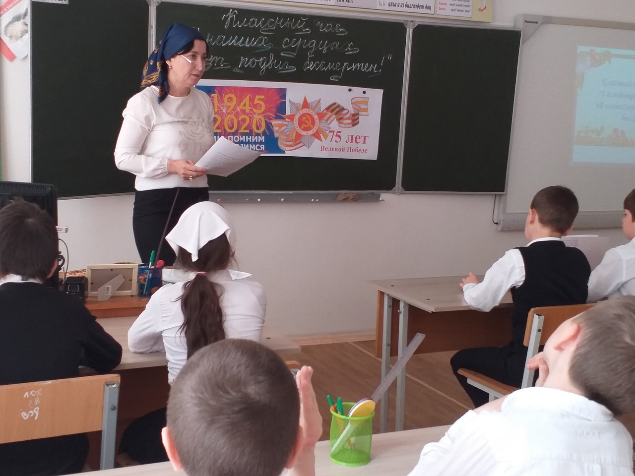 Классный руководитель Мухаева Л. С. рассказала учащимся, во имя чего совершались подвиги, переносились неимоверные тяготы и лишения, почему наши отцы и деды жертвовали собой во время Великой Отечественной.Учащиеся прочувствовали эти героические страницы истории, когда рассказывали о Х. Нурадилове, М. Мазаеве, М. Висаитове, И. Бейбулатове, К. Абдурахманове и других.На вопрос классного руководителя: «Что война несет людям?», дети ответили: «Война – это страх, ужас, смерть, беда и много другое».Ребята пожелали, чтобы на планете Земля никогда больше не было войны!