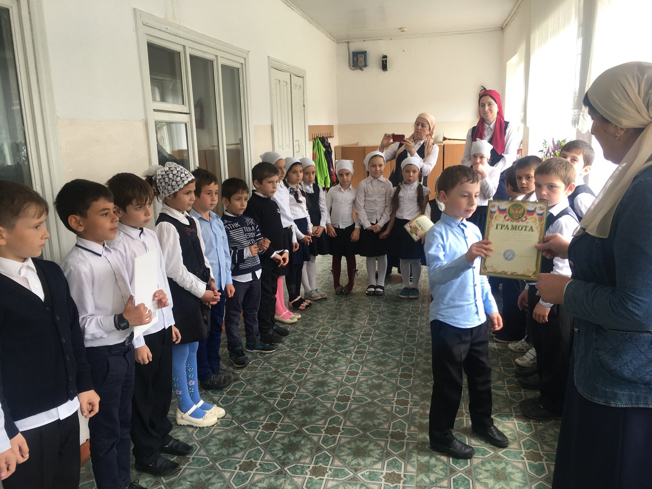 15.05.201715 мая торжественная линейка состоялась среди начальных классов, среди которых были победители районных конкурсов песни и чтецов: Изиева Самира – 1-е место в районном конкурсе чтецов (1а); Сатуева Есита – 2-е место в районном конкурсе песни (3б); Исмаилов Р. – 3-е место в районном конкурсе чтецов (1б). Почетные грамоты были вручены командам 1а и 1б классов за конкурс «Знатоки азбуки».