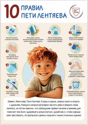 14.10.202410 правил Пети Лентяева Творческая работа одного из победителей Всероссийского конкурса детских рисунков «Персонаж здорового образа жизни» 2023 года, где был изображен Петя Лентяйкин, вдохновила команду Роспотребнадзора создать познавательные и яркие визуальные материалы для детей. Так появился Петя Лентяев - веселый школьник, задорный мальчишка, который раньше ленился, но потом понял, что соблюдение простых правил гигиены, правильное питание и здоровый образ жизни помогают лучше себя чувствовать и хорошо учиться. Теперь Петя в доступной и простой форме рассказывает другим детям про важные правила заботы о здоровье.