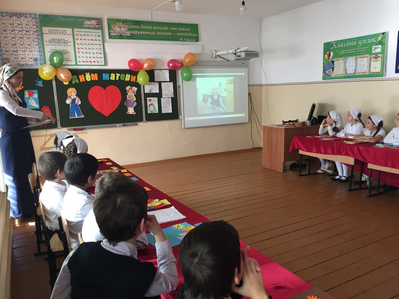 Ребятам придавало удовольствие присутствие на празднике любимых мам. Мероприятие началось с выступления Осмаева С., он рассказал об истории возникновения праздника. Программа насыщена разнообразными номерами: стихи, песни, стихотворения, открытки для мам, видеоролик с поздравлениями детей. В конце мероприятия дети на табличках написали самые приятные определения о сокровищнице материнского сердца и наполнили ими «Сердце матери». Праздник для мам завершился вручением открыток, оформленных собственными руками детей.