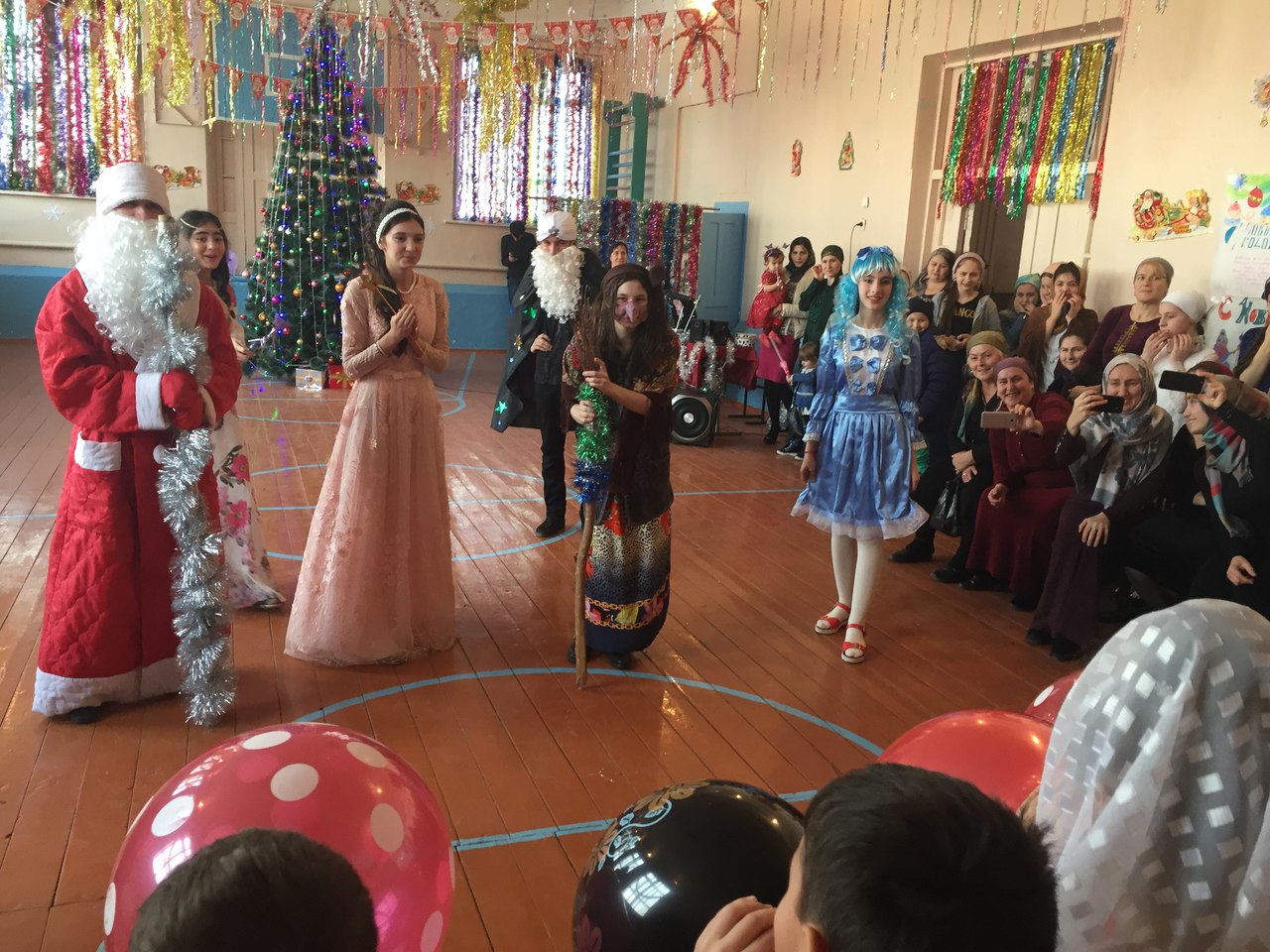 В преддверии новогодних праздников в школе был проведен конкурс рисунков «Зимняя сказка», в котором приняли участие учащиеся 1-9 классов, лучшие рисунки были выставлены в зале празднования Нового Года. Учащиеся старших классов оказали большую помощь организатору Адуевой А. С. в украшении елки, заместитель директора по ИКТ Садулаева Д. У. разрисовала веселых сказочных героев на стенах зала. На новогоднем празднике царила атмосфера радостного настроения, непринужденной дружественной обстановки. Детям являлись сказочные герои: Фея, Мальвина, Золушка, Леший, Кикимора, Баба-Яга, Дед Мороз, Снегурочка, добрый Волшебник. Дети веселились от души, герои праздника водили хороводы, участвовали в массовых играх, конкурсах, приглашали пары на лезгинку, строго соблюдая этику народного танца. Каждый этап праздника заканчивался вручением Дедом Морозом новогодних подарков детям. Выражаю благодарность учащимся, сыгравшим роли сказочных героев: Азаматову У., Истамиловой Х., Мурадовой И., Рахмаевой Х., Абдулаевой К., Махаевой Х., Оздоевой М., Индербаеву И. и Мусхаджиеву Ж.
