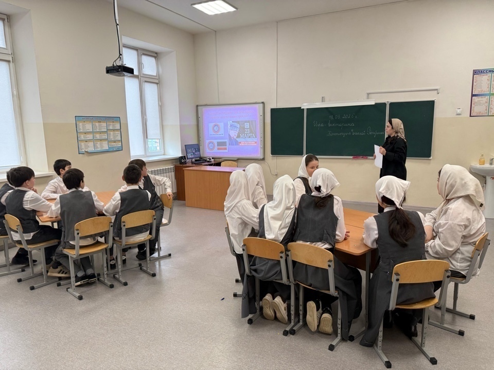 22.03.2025В МБОУ «СОШ2 ст.Ассиновская им. Муташева Х.Р» прошла игра-викторина «Наши права и обязанности» ко Дню Конституции Чеченской Республики .Цель данного мероприятия является знакомство учащихся с понятиями : закон , порядок , право ; знакомство с символикой республики : флагом , гербом , гимном, также воспитание гордости за свою республику.