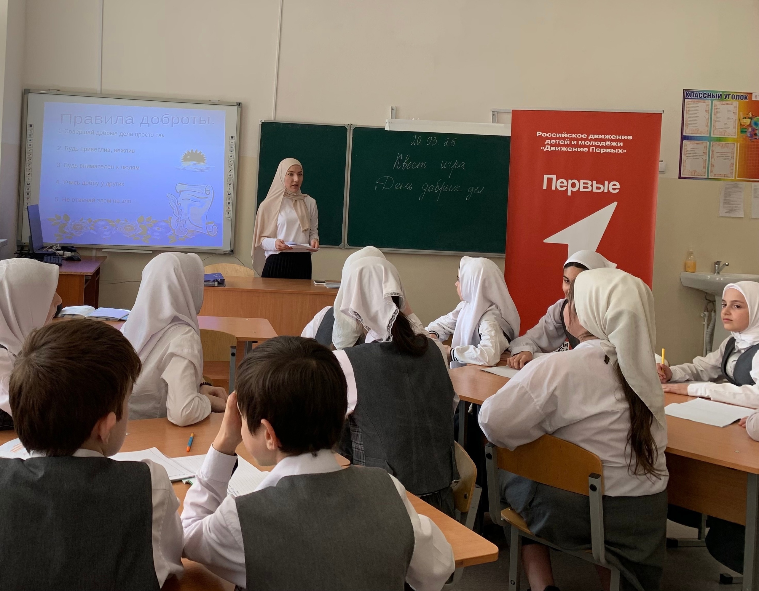 20.03.202520.03.2025 г. педагог-организатор Сагаева М.М. провела Квест игру "День добрых дел" с активистами Движения первых. Участники разделились на команды и выполняли различные задания, направленные на развитие доброты и сотрудничества.