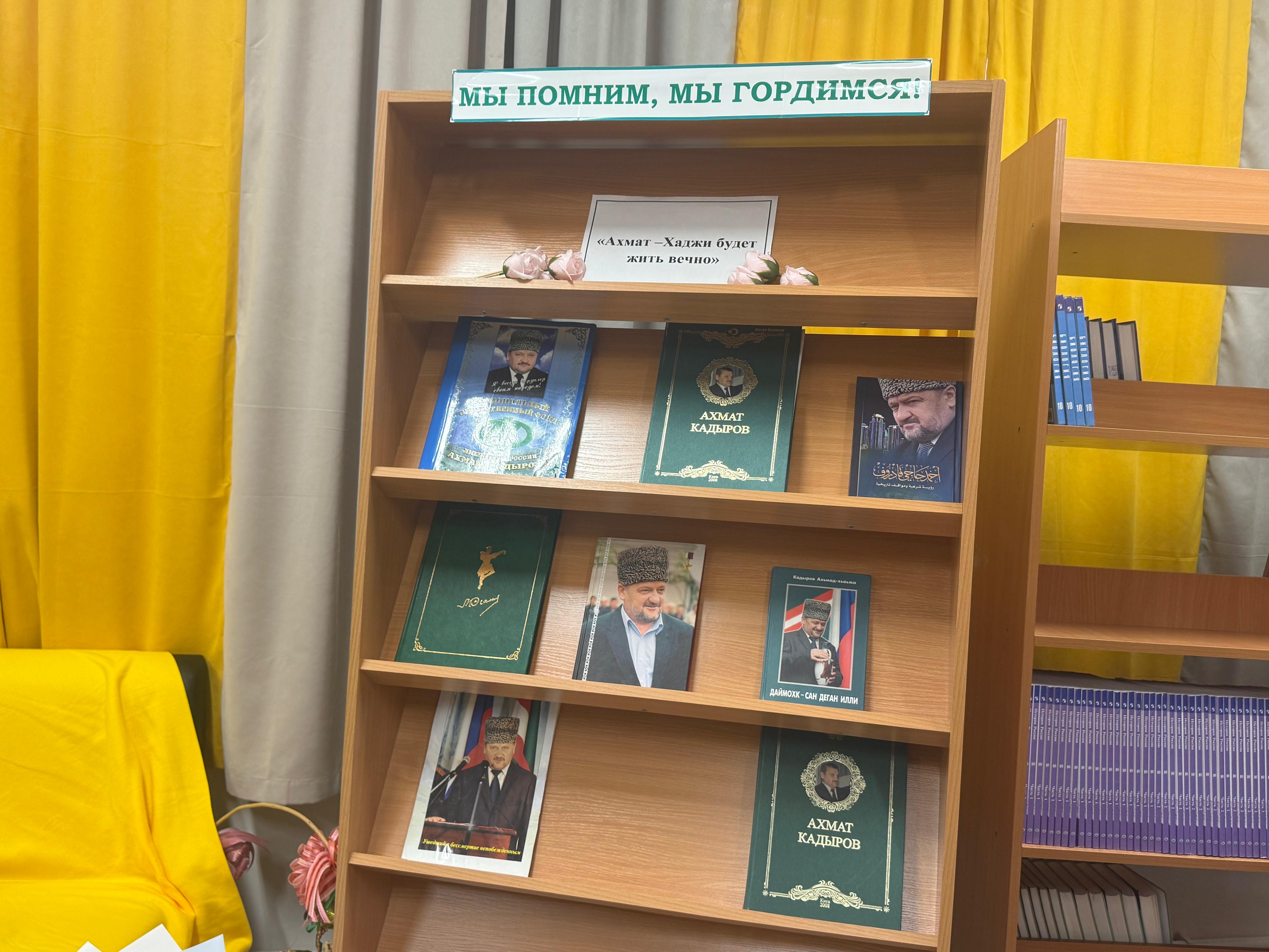 В связи с этой знаменательной дате в библиотеке нашей школы оформлена книжная выставка .На выставке были представлены книги о биографии и семье Первого Президента, сборник стихотворений, написанный Ахмат-Хаджи Кадыровым, его фотографии.