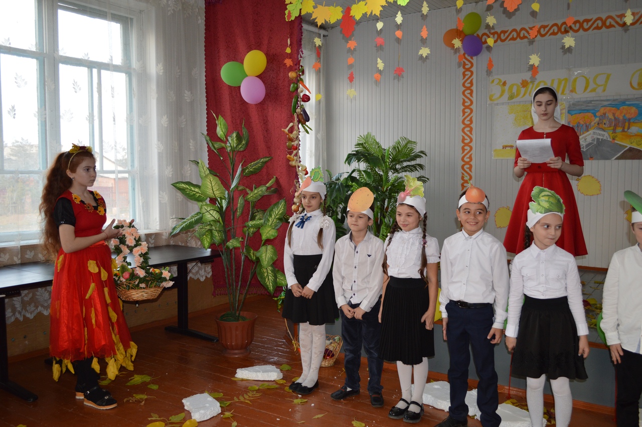 В красочно оформленном актовом зале царила теплая, доброжелательная атмосфера. Завораживающим было явление Осени – хозяйки праздника, в роли которой выступала учащаяся 7б класса Наурдиева Залина. Но вот сюжет таков, что некоторые ребята хотели задержать лето и, Осень покинула праздник. «Наступила зима, ударили холода, лесные зверьки не успели запастись едой, нарушена смена года. И вот ребята попросили Осень вернуться к ним, осознали свои ошибки – нельзя нарушать природный цикл». Осень пришла, и все стало на место – море улыбок, веселья. Хоть и говорят, что осень унылая пора, но дети радовались листьям под ногами, отгадывали загадки, пословицы. На прощание Осень раздала детям яблоки, айву, гранаты и т.д. Вот почему праздник осени в нашей школе является одним из самых любимых у детей.