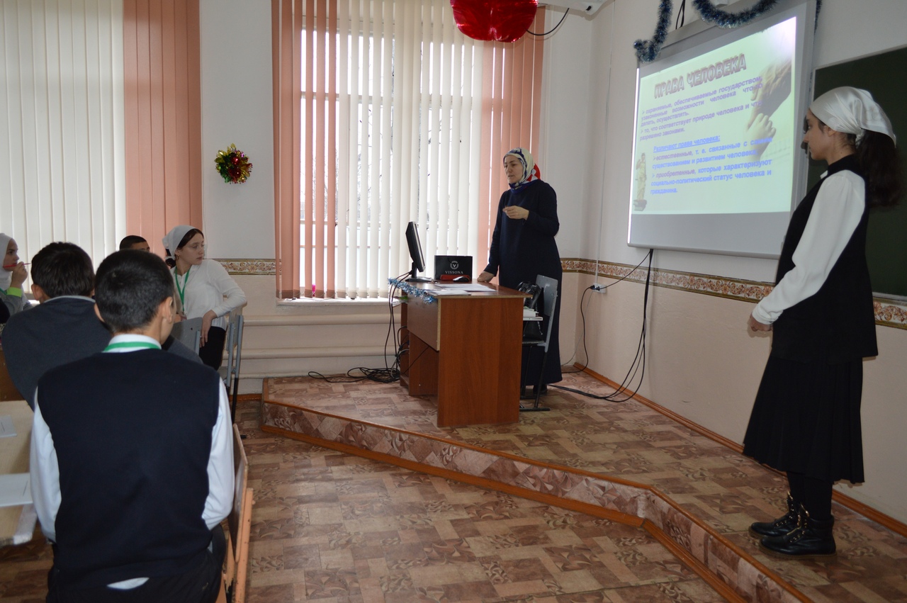 Совместно с классным руководителем Амриевой Р. А. девятиклассники обобщили знания о личных правах человека, об основных правовых документах: Всеобщей декларации прав человека, Конституции, Конвенции о правах ребенка и т. д. Мероприятие было призвано формировать сознательное отношение, как к правам, так и к обязанностям человека.