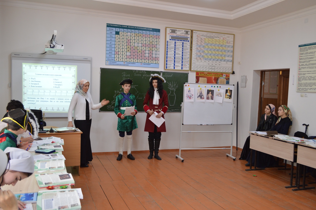 На открытом уроке истории учителя Амриевой Р. А. по теме: «Дворцовые перевороты, педагоги смогли приобщиться к эпохе дворцовых переворотов, целая плеяда государственных деятелей XVIII века предстали перед гостями - «Петр I, А. Д. Меншиков, Екатерина II, гвардейцы». Столь же эмоционально и активно прошел открытый урок ОРКСЭ «Распространение ислама в мире» учителя начальных классов Махаури Э. Б. Музыкально-развлекательная композиция «И в шутку и всерьез», подготовленная учителями начальных классов Муслиевой М. Р. и Мухаевой Л. С. никого не оставила равнодушным. Юмористические сценки, песни, стихотворения, артистизм, все продемонстрировали наши юные артисты. Очевидно, что в наши дни необходимо шагать в ногу со временем – современный урок должен быть прогрессивным, интересны, а для этого нужно желание, творческий подход, знание информационных технологий, веры в себя и своих учеников. Вот этими качествами обладают наши педагоги.