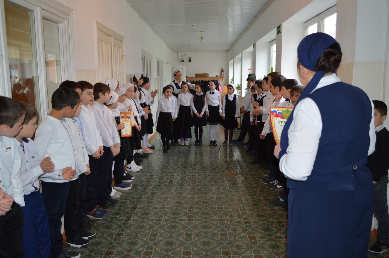 Вначальной школе проведена линейка по награждению победителей школьных и районных конкурсов патриотической песни, рисунков, чтецов – это Сатуева Самира, Махамашева Иман (3б), Сулеманова Иман (2б), учащиеся 4а класса – Асхабова Дагмара, Осмаева Ясмина, Терхоева Амина (4а), за 2ое место в районном конкурсе патриотической песни награждалась дебютантка Терхоева Ясмина. Мы гордимся нашими детьми и желаем им новых и новых успехов в учебе и творчестве!