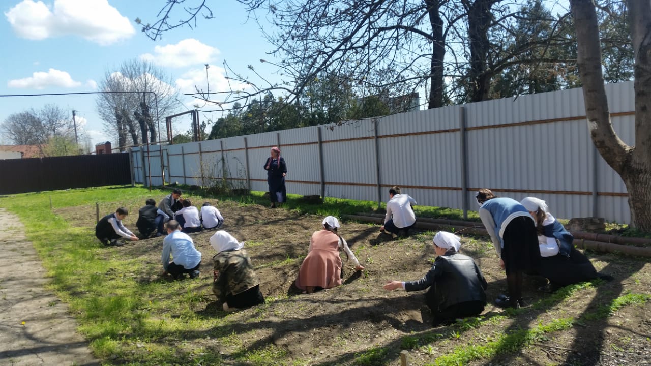 С наступлением весны начинается работа на пришкольных участках. 12 апреля 2019 года учащиеся 7а и 7б классов решили очистить свои участки от сорняков. Руководила работами на участках учитель технологии Гелаева А. Б.
